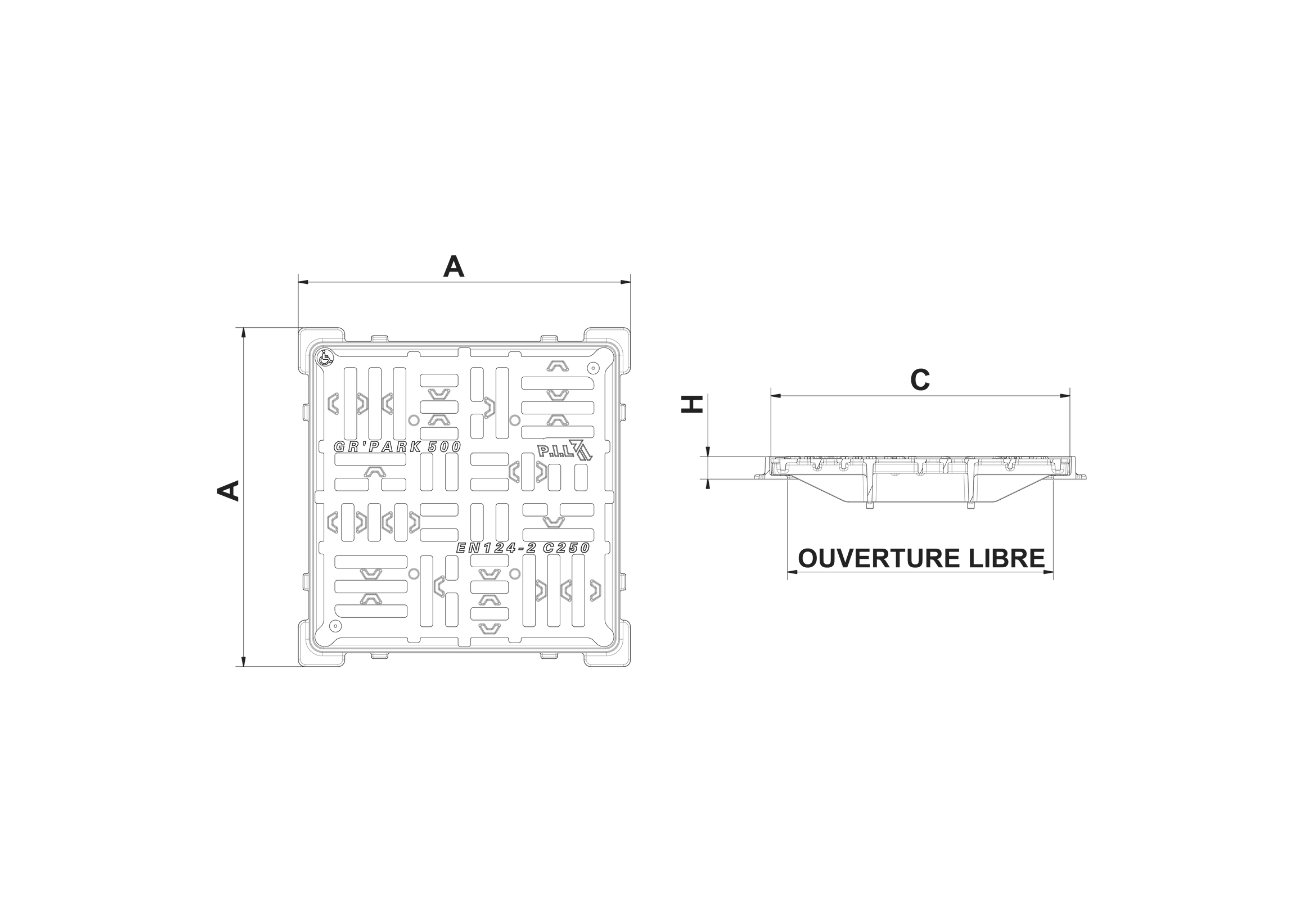 GRPARK700 Grille plate avec cadre carré C250 700x700mm PMR GR'PARK700 Données produit Référence Dimensions (mm) Hauteur (mm) Ouverture libre (mm) Surface d'avalement (dm²) Masse (kg) My P.I.L GRPARK700 740 x 740 40 640 x 640 1 830 53,9 Quantité Decrease quantity Increase quantity Réinitialiser la quantité Téléchargement Fiche technique Characteristic Value Dimensions (mm) 740 x 740 Hauteur (mm) 40 Ouverture libre (mm) 640 x 640 Surface d'avalement (dm²) 1 830 Masse (kg) 53,9 My Wrekin Quantité Decrease quantity Increase quantity Réinitialiser la quantité Téléchargement Fiche technique Images Données produit Informations générales Stock code GRPARK700 Category Collecte des eaux Normes, classes et groupes Standards EN 124 BS EN 124 Class C250 BS EN 124 Group 3 Dimensions Frame shape Carré Manhole shape Carré Overall frame (A x B) 740 mm x 740 mm Clear opening 640 mm x 640 mm Frame depth (H) 40 mm Waterway area 1 830 cm² Weight 53,9 kg Téléchargements P.I.L - GRPARK C250 - Grille carrée plate rev_B.pdf Téléchargement-pdfNotice de pose - GRPARK EFFUSIO.pdf Téléchargement-pdf