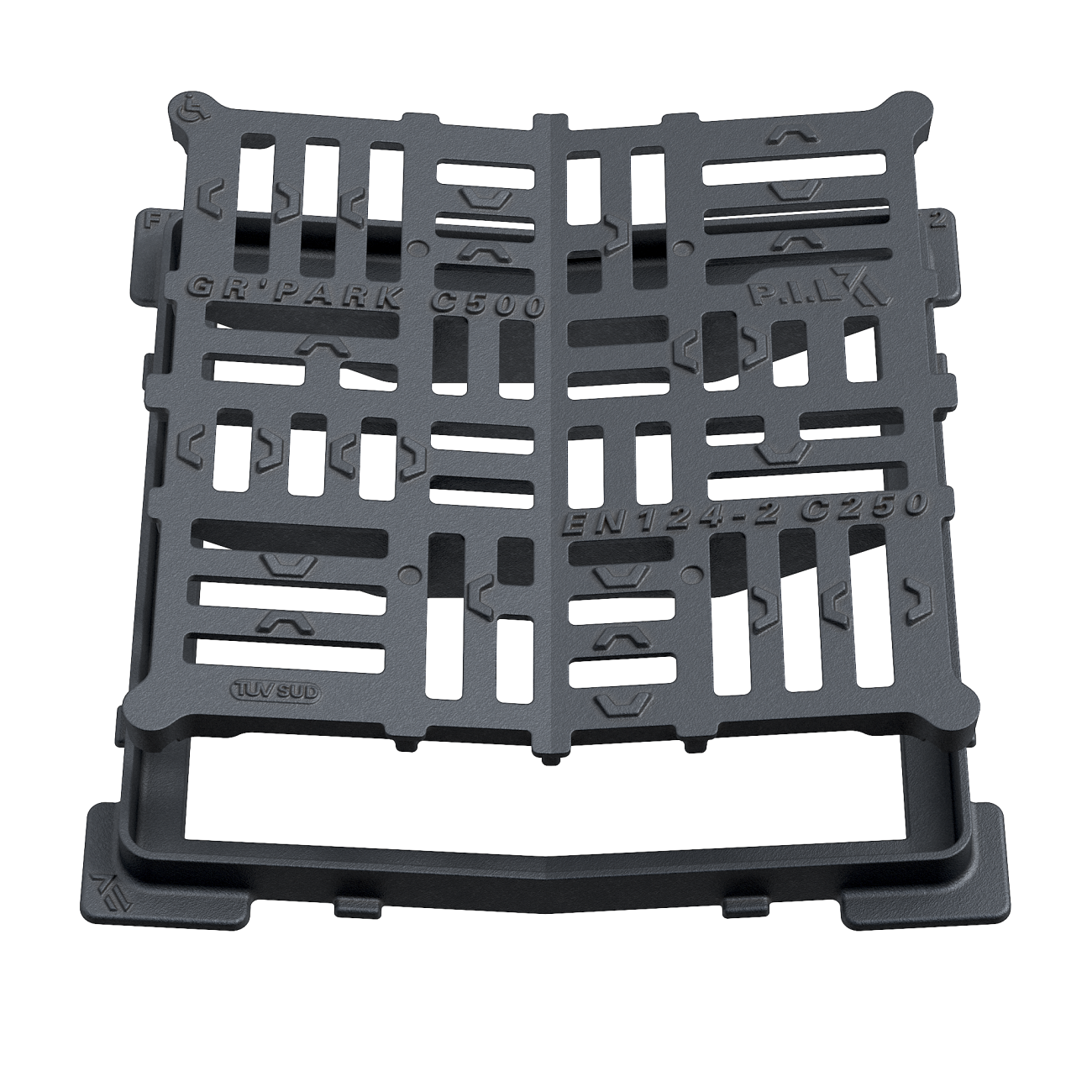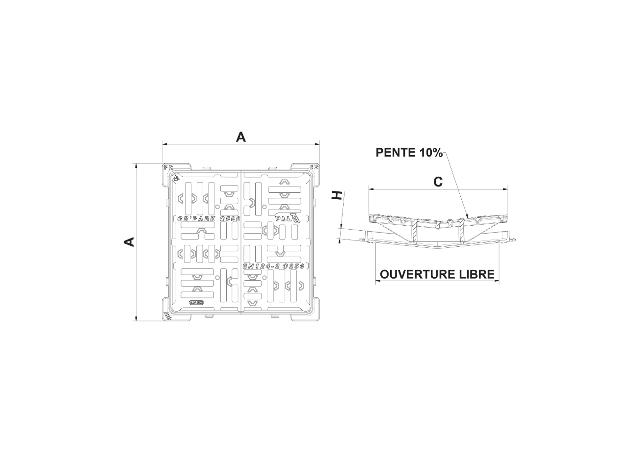 GRPARK_C500 Grille concave avec cadre carré C250 500x500mm PMR GR'PARK_C500 Données produit Référence Dimensions (mm) Hauteur (mm) Ouverture libre (mm) Surface d'avalement (dm²) Masse (kg) My P.I.L GRPARK_C500 510 x 510 34 400 x 400 840 21,5 Quantité Decrease quantity Increase quantity Réinitialiser la quantité Téléchargement Fiche technique Characteristic Value Dimensions (mm) 510 x 510 Hauteur (mm) 34 Ouverture libre (mm) 400 x 400 Surface d'avalement (dm²) 840 Masse (kg) 21,5 My Wrekin Quantité Decrease quantity Increase quantity Réinitialiser la quantité Téléchargement Fiche technique Images Données produit Informations générales Stock code GRPARK_C500 Category Collecte des eaux Normes, classes et groupes Standards EN 124 BS EN 124 Class C250 BS EN 124 Group 3 Dimensions Frame shape Carré Overall frame (A x B) 510 mm x 510 mm Clear opening 400 mm x 400 mm Frame depth (H) 34 mm Waterway area 840 cm² Weight 21,5 kg Téléchargements P.I.L - GRPARK_C C250 - Grille carrée concave rev_B.pdf Téléchargement-pdfNotice de pose - GRPARK EFFUSIO.pdf Téléchargement-pdf