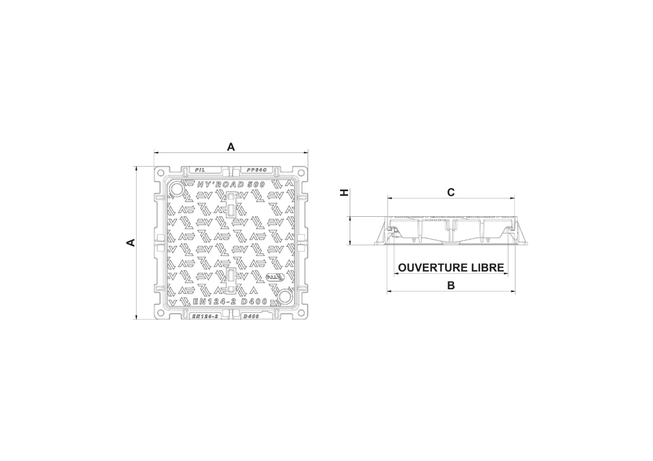 H7D400 Regard hydraulique verrouillé à cadre carré D400 700x700mm HY'ROAD700 Données produit Référence Dimensions (mm) Hauteur (mm) Ouverture libre (mm) Masse (kg) My P.I.L H7D400 740 x 740 100 600 x 600 70 Quantité Decrease quantity Increase quantity Réinitialiser la quantité Téléchargement Fiche technique Characteristic Value Dimensions (mm) 740 x 740 Hauteur (mm) 100 Clear opening (mm) 600 x 600 Masse (kg) 70 My Wrekin Quantité Decrease quantity Increase quantity Réinitialiser la quantité Téléchargement Fiche technique Images Données produit Informations générales Stock code H7D400 Primary material Fonte ductile Category Dispositifs de fermeture Normes, classes et groupes Standards EN 124 BS EN 124 Class D400 BS EN 124 Group 4 Dimensions Frame shape Carré Manhole shape Carré Overall frame (A x B) 740 mm x 740 mm Clear opening 600 mm x 600 mm Frame depth (H) 100 mm Weight 70 kg Téléchargements P.I.L - HYROAD D400 - Regard hydraulique à cadre carré rev_B.pdf Téléchargement-pdfNotice de pose - HYROAD GRROAD.pdf Téléchargement-pdfPlan de réservation - HYROAD GRROAD.pdf Téléchargement-pdf