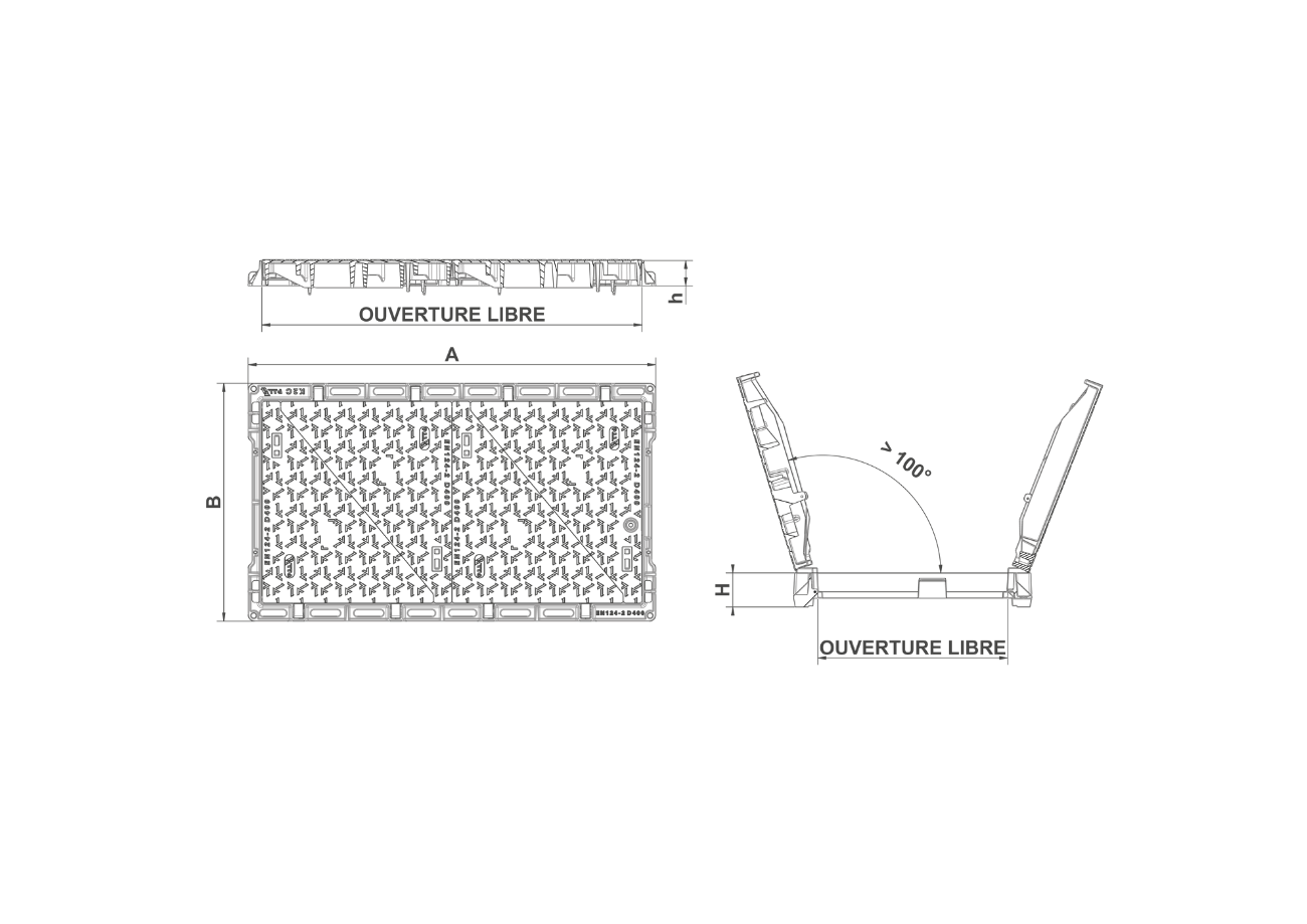PILK2C_F Trappe d'accès articulée avec cadre fonte K2C_F D400 Données produit Référence Dimensions (mm) Hauteur (mm) Ouverture libre (mm) Masse (kg) My P.I.L PILK2C_F 1 610 x 940 135 1 500 x 750 246 Quantité Decrease quantity Increase quantity Réinitialiser la quantité Téléchargement Fiche technique Characteristic Value Dimensions (mm) 1 610 x 940 Hauteur (mm) 135 Ouverture libre (mm) 1 500 x 750 Masse (kg) 246 My Wrekin Quantité Decrease quantity Increase quantity Réinitialiser la quantité Téléchargement Fiche technique Images Données produit Informations générales Stock code PILK2C_F Category Trappes pour réseaux secs Number of lids 4 Normes, classes et groupes Standards EN 124 BS EN 124 Class D400 BS EN 124 Group 4 Dimensions Frame shape Rectangulaire Manhole shape Rectangulaire Overall frame (A x B) 1 610 mm x 940 mm Clear opening 1 500 mm x 750 mm Frame depth (H) 135 mm Weight 246 kg Téléchargements P.I.L - KC_F D400 - Trappe standard type KC articulée Rev_B.pdf Téléchargement-pdfNotice de pose - Réseaux secs D400.pdf Téléchargement-pdfP.I.L - GAC - Grille antichute pour réseaux secs rev_B.pdf Téléchargement-pdfNotice de pose - Grille antichute.pdf Téléchargement-pdf